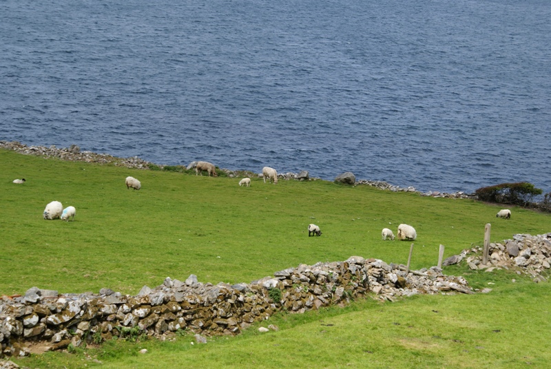 Tout les clichés concernant l’Irlande sont au rendez vous. Prés vert séparés par ses murets de pierres sèches ou paissent paisiblement des moutons ou des chevaux. Mer entrant dans les terres dès qu’une roche plus friable est détectée. Harcelé jusqu’à être broyé par les déferlantes.